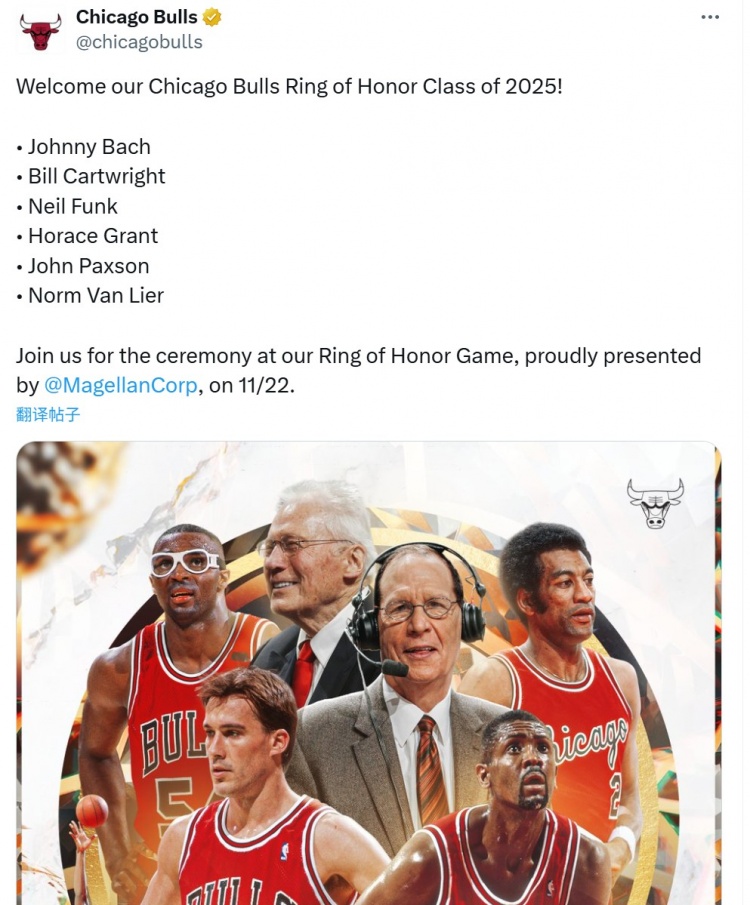 9月12日讯 公牛队公布了第二届入选荣誉之戒(Ring of Honor)的成员,本次仪式将在当地时间11月22日进行。